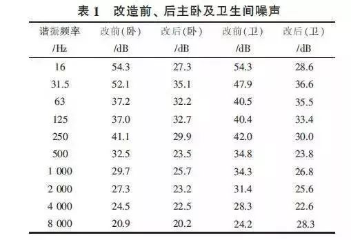 為了對改造前、后的效果進行對比,選取該小區(qū)14幢1單元101室主臥室及衛(wèi)生間作為測量點,對改造前的噪聲進行測量, 依據(jù)配電房干式變壓器發(fā)出不同的諧振頻率測量出噪聲大小的變化,測量結(jié)果如表1所示。