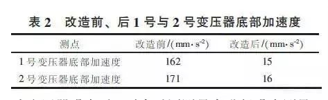 通過對配電房內(nèi)1號、2 號干式變壓器底部加速度進行測量,測量結(jié)果如表2所示。