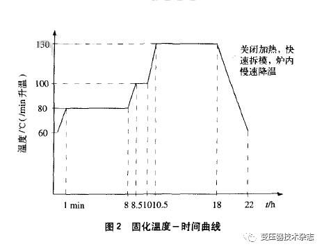 澆注好的模具必需在固化爐內(nèi)依照固化溫度一時候曲線停止加熱固化。進(jìn)程中,需包管固化爐內(nèi)溫度平均。固化溫度~時候曲線如圖2所示。